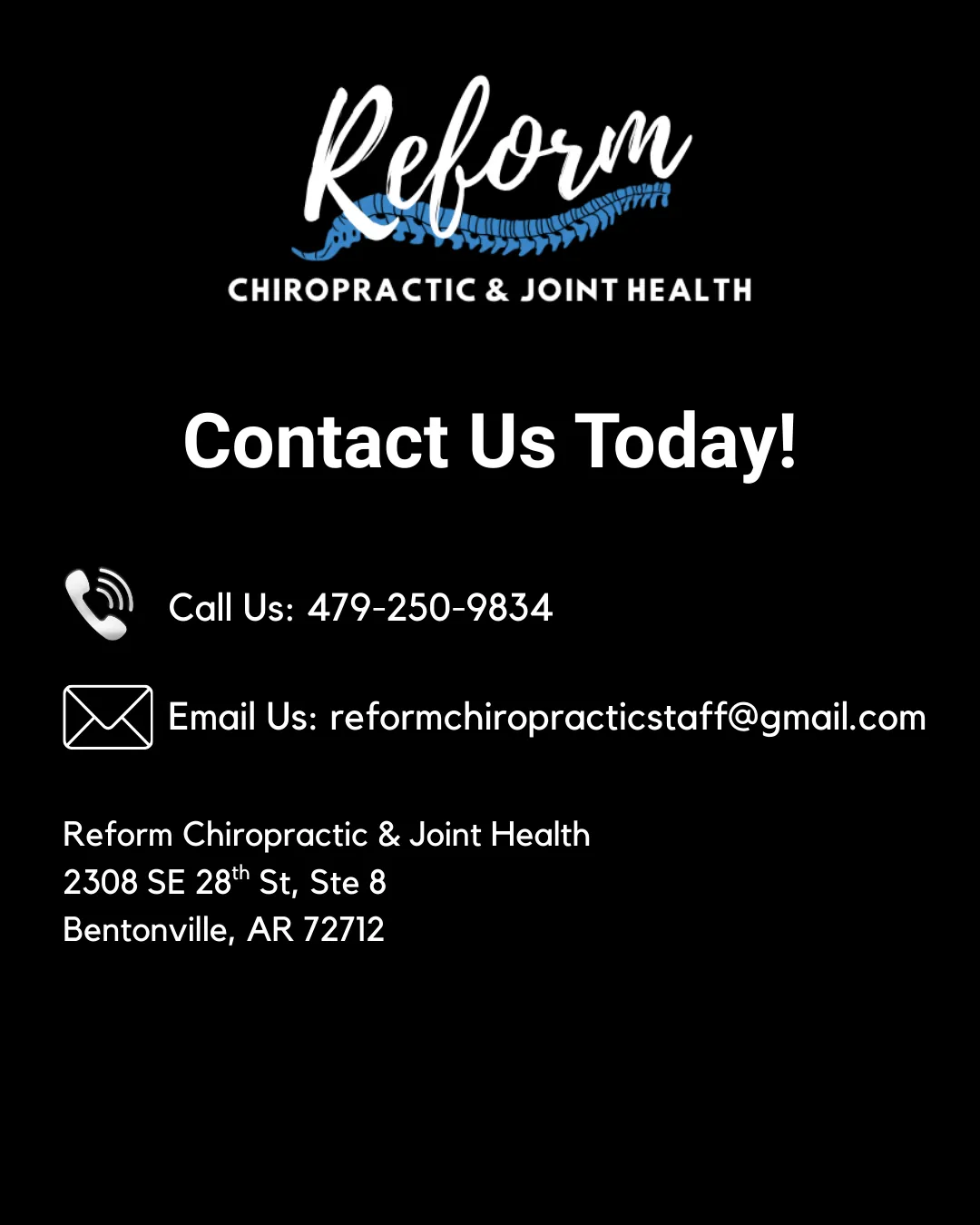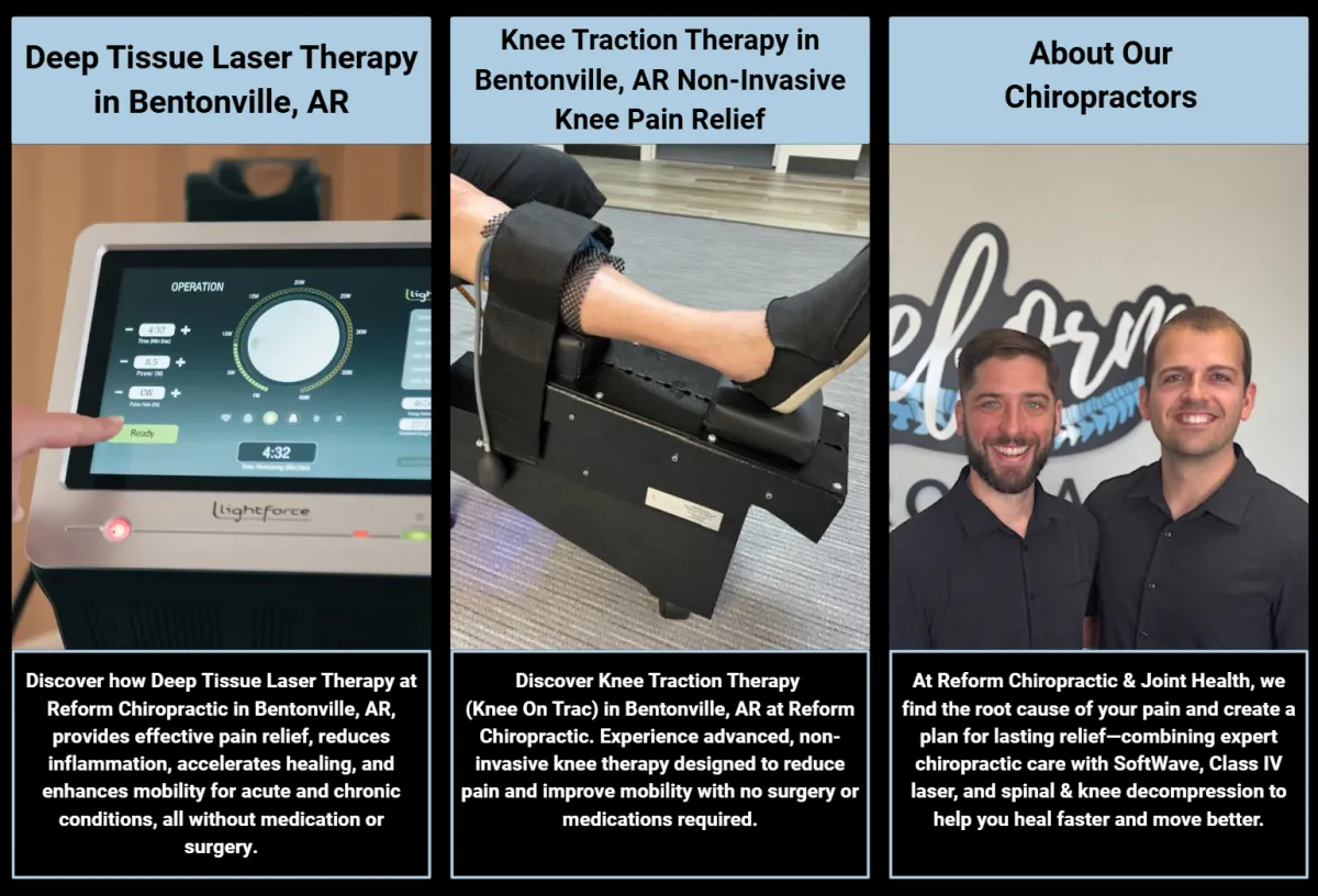 At Reform Chiropractic, our focus is on uncovering the root cause of your discomfort to help you build a stronger, more resilient foundation for health. We are dedicated to providing chiropractic care and joint health to the Bentonville community.